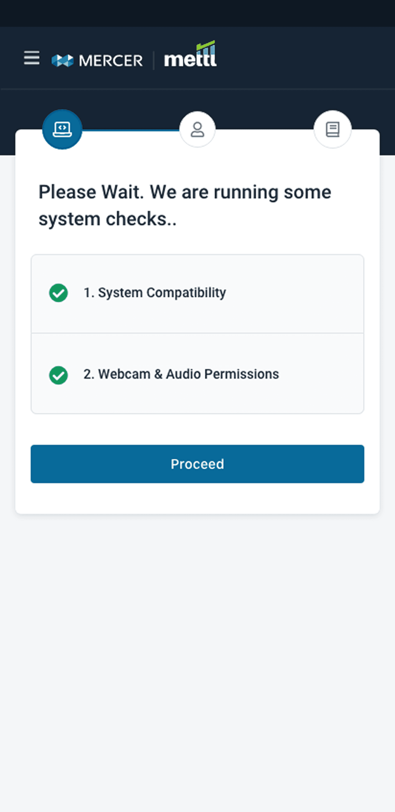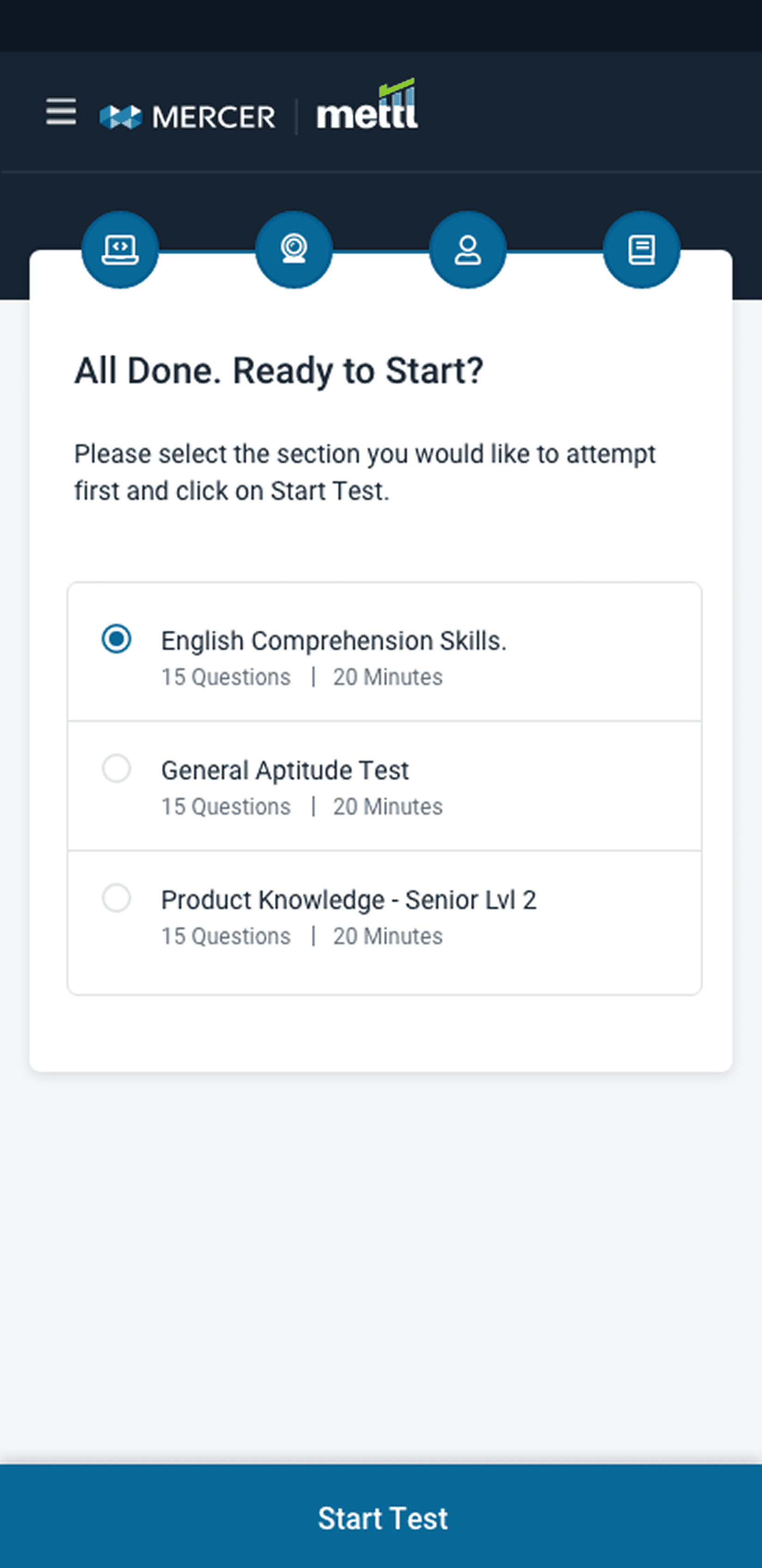 • The journey begins with accessing the test and passing mandatory system/proctoring checks (webcam, ID verification, secure environment setup).